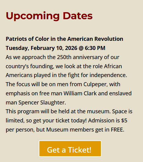 The Culpeper 250 Website is live highlighting the pivitol role our county played leading up to the Revolutionary War. There is a section on People of African Descent & The Revolutionary War – African Americans & The Revolutionary War | Culpeper 250