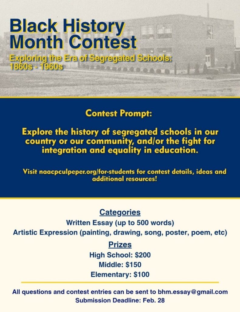 Each year in February, The Culpeper NAACP Education Committee sponsors an essay contest to commemorate Black History Month. Prizes are awarded at the elementary, middle, and high school level, and contest winners are invited to read their essays at our March meeting and join us for a special field trip in June.